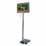 Детская мобильная стойка для игры в баскетбол с щитом из полиэтилена. Для установки в помещении и на улице. В основание размерами 75 х 45 х 13 см необходимо залить воду или засыпать песок объёмом 0,043 м 3 (а именно 43 литра). Телескопическая регулировка высоты от 165 до 260 см (по кольцу). Диаметр стойки (трубы, к которой крепятся щит и основание) составляет 4,5 см. Баскетбольное кольцо 38 см, цвет оранжевый. Всепогодная нейлоновая сетка в комплекте.